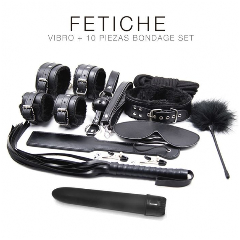KIT VIBRO Y 10 PIEZAS BONDAGE SET NEGRO