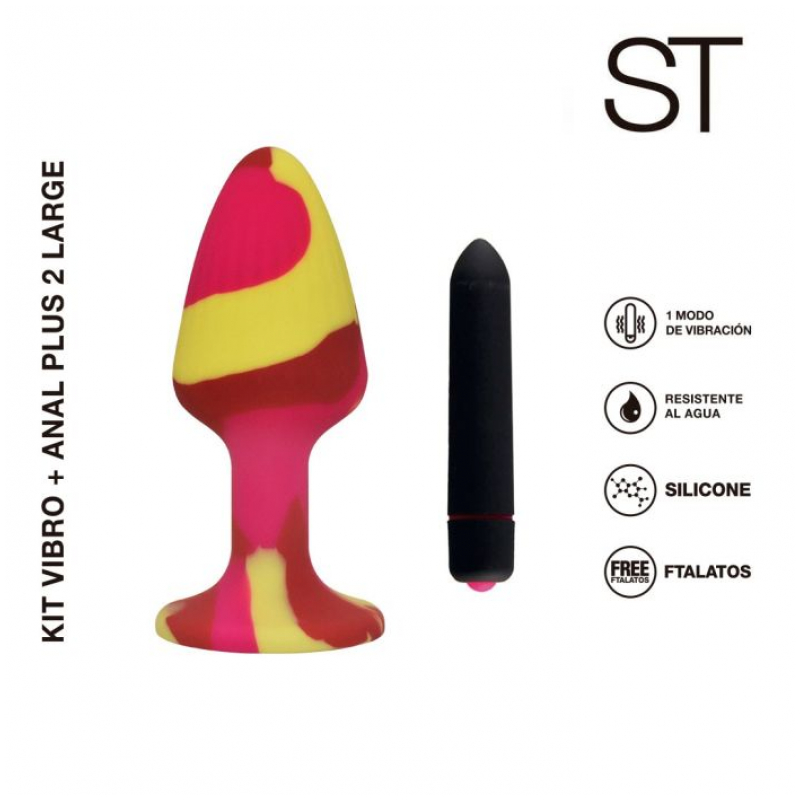 Kit compuesto por plug anal arco iris, forma de estaca con tope y ventosa en la base, uso anal de forma segura.