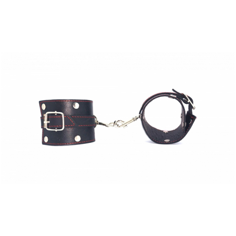 Esposas de cuero,regulables con detalles metálicos de tachas hebillas y mosqueton, que permite unir o separar en cualquier momento de la relación.