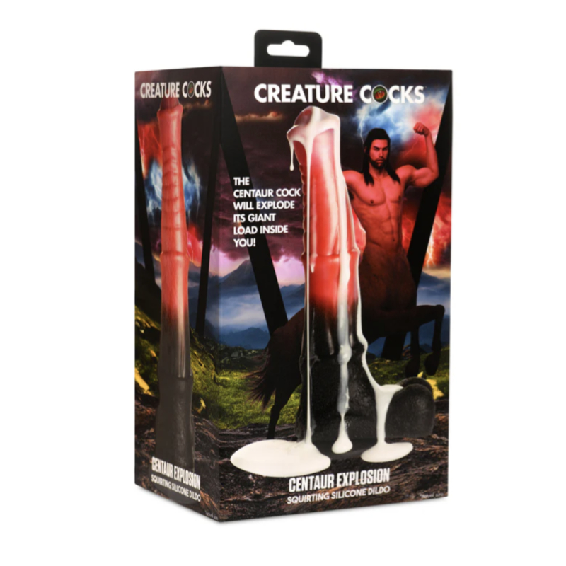 ¡Cumple tus fantasías llenándote de fluidos explosivos y chorreantes con este dildo grueso de centauro! Este grueso pene de centauro es de color melocotón y negro con una cabeza ensanchada.