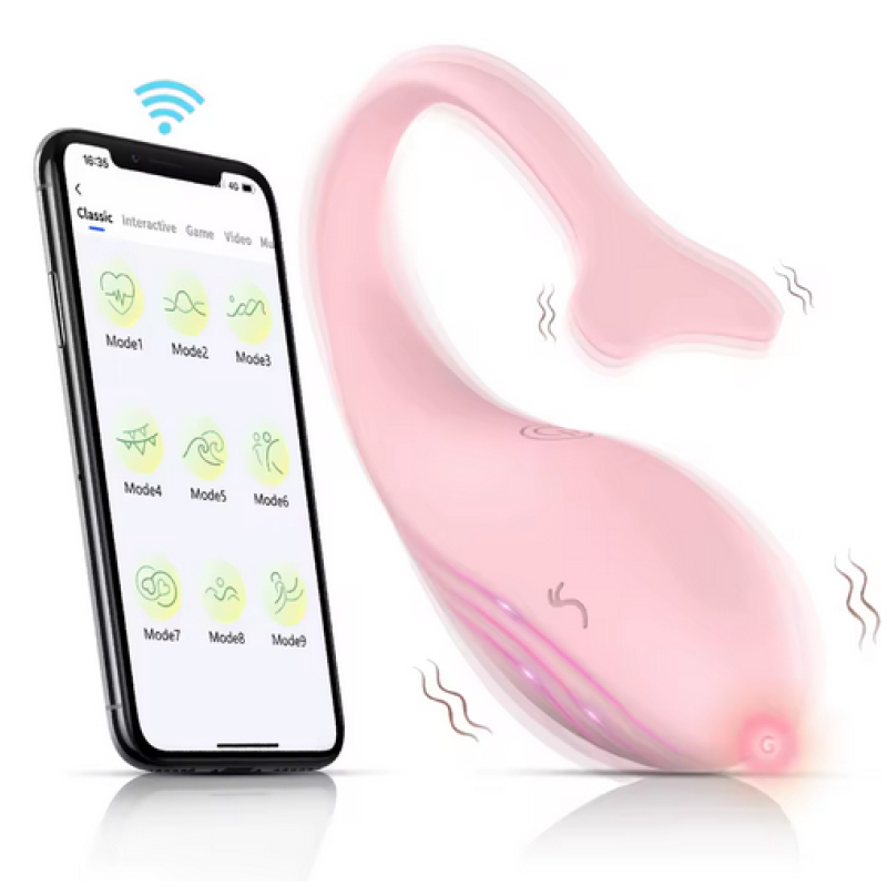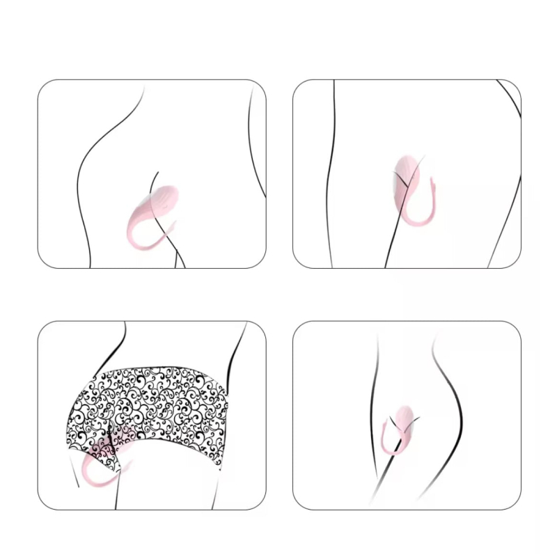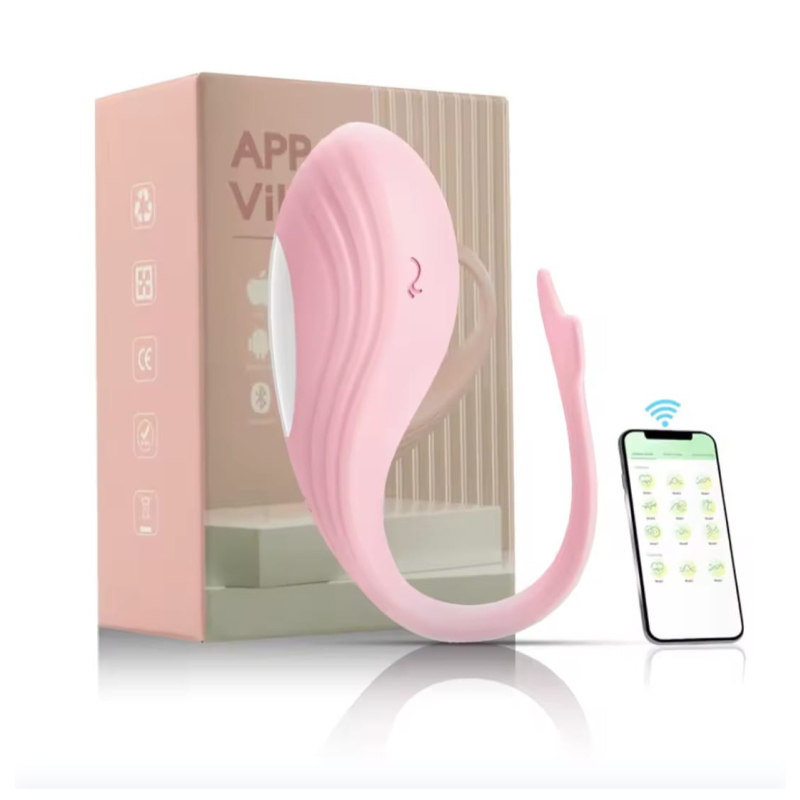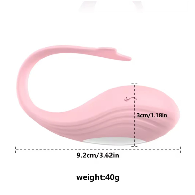 Línea de estimuladores discretos, forma de huevito de silicona con cola, para colocar en la lencería, o penetrar, con agarre de salida cómodo, flexible, e intensas vibraciones con ritmos variados a elección desde el celular, (música, tono de voz, dibujos de patrones, etc).